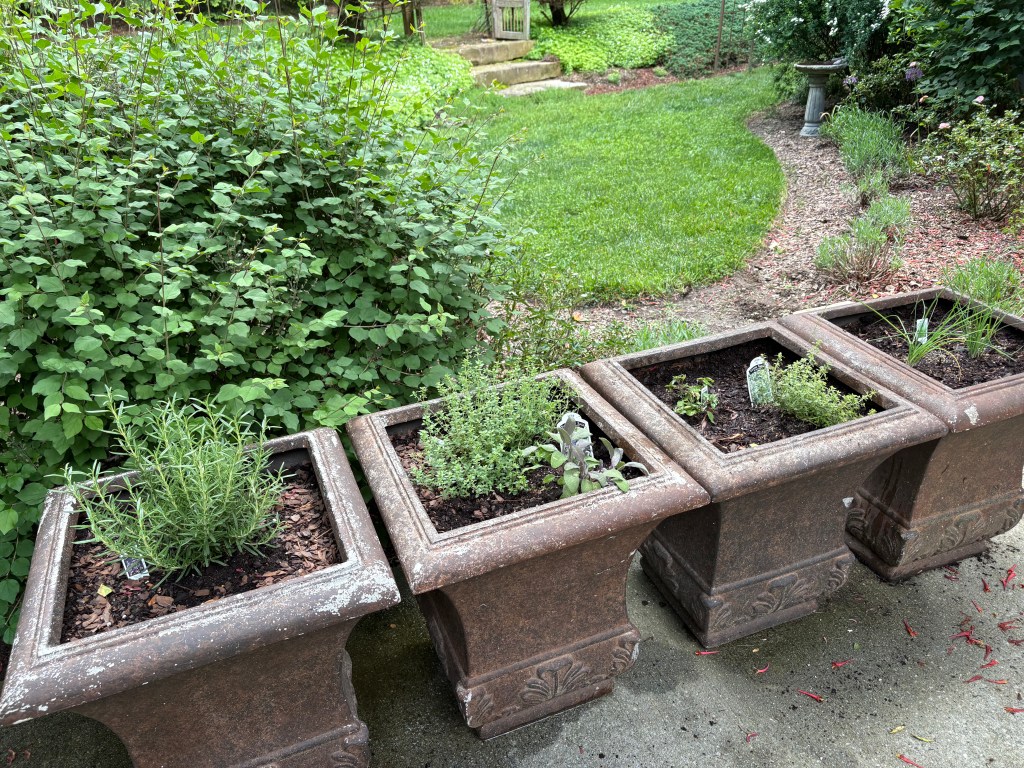 I love the patina on the brown herb pots, distressed and peeling. These pots have been moved around the garden over the years. They are a gift of time.
